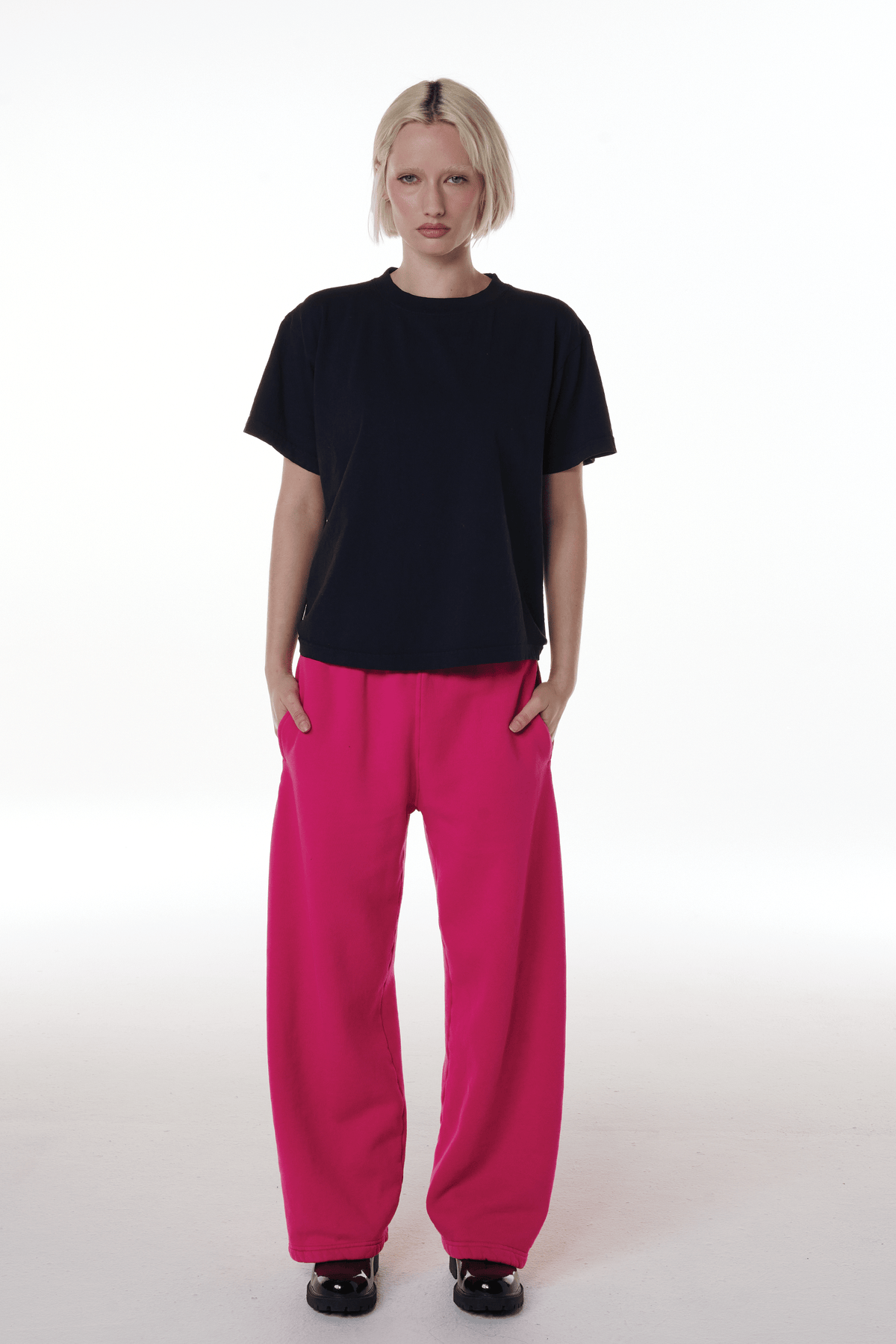 Designed with a slightly loose neck opening and a thick 1” rib collar, the T-shirt offers a comfortable yet structured fit. Its boxy fit, slightly dropped shoulders, and cropped length just below the belt line make it a modern, effortless staple.